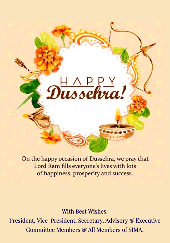Wishing you and all your family a happy Dussehra. 62 Views | Wednesday, October 1, 2025 | Best Wishes View All News Wishing you and all your family a happy Dussehra. Other News by SIMA Interaction with Experts on various issue SIMA NEW MEMBER - ASIA PACIFIC MARBLES LIMITED FICCI-CMSME invites inputs on GST recommendations. Online Seminar on Decoding Govt. Stimulus package for MSMEs. Details required related to COVID -19 Vaccinations Coverage in Commercial Establishments.